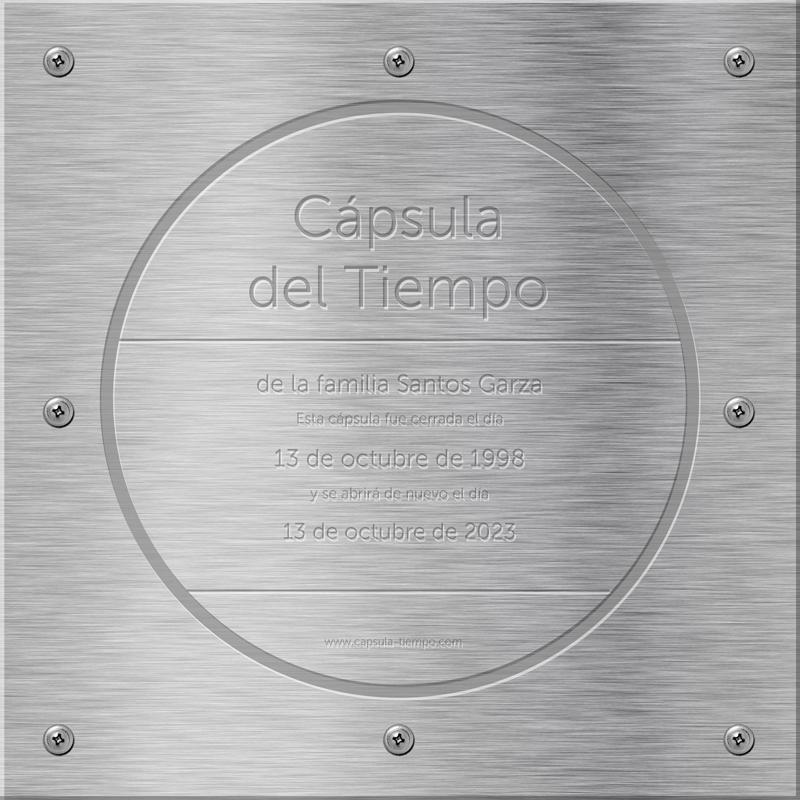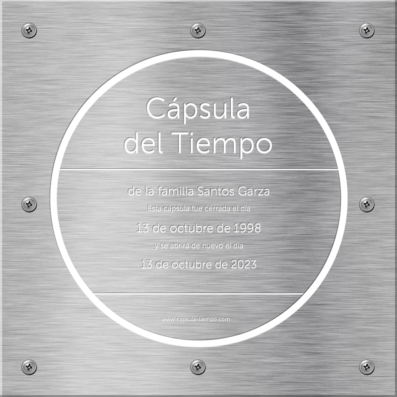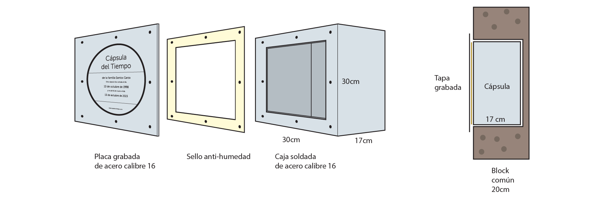 La cápsula se compone de tres elementos: Tapa, empaque y caja. La tapa y la caja están hechos de acero inoxidable de calibre 16, por lo que puede durar más de 100 años en perfecto estado. El empaque siliconizado evita que se cuele la humedad al interior de la caja.