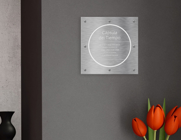 Tapa de acero de 33x33cms grabada con el diseño y fecha seleccionado.